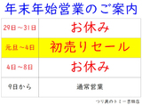 [吉田店]12月29日 お休み12月30日 お休み12月31日 お休み元旦 初売りセール AM9:00~PM3:002日 初売りセール AM9:00~PM3:003日 初売りセール AM9:00~PM...続きを読む