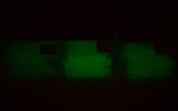 グロー塗料を多く入れてありますので紫外線ライトで蓄光すると、かなり明るく発光します!